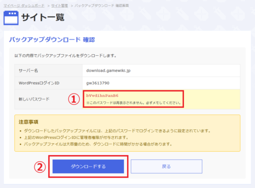 圧縮ファイルをダウンロードする際、画面にWordPressのログインユーザーIDとパスワードが表示されます(➀)。必ずメモに控えてください。