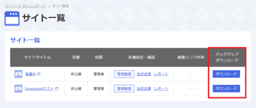 マイページにログインし、左メニューの「サイト管理」>「サイト一覧」をクリックします。